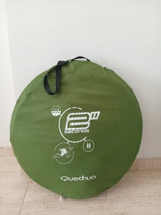 Tienda de campaña Quechua, ideal para escapadas. - Modelo 2 Seconds. - Peso: 4.7 kg. - Dimensiones: 210 cm x 210 cm x 115 cm.