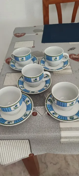 Conjunto de tazas y platillos con un diseño floral y a cuadros. - Incluye 5 tazas. - Incluye 5 platillos. - Diseño con motivos florales azules y cuadros blancos y azules.