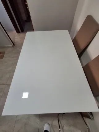 Elegante mesa de comedor con un diseño contemporáneo que combina a la perfección con cualquier decoración. - Superficie de color blanco brillante. - Patas y estructura de metal plateado pulido.