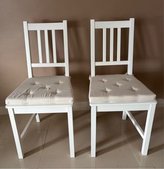 • PRECIO NO NEGOCIABLE. • POSIBILIDAD DE LLEVAR HASTA SANTA CRUZ O LA LAGUNA. 2 Sillas con cojín. Stefan. Ikea. Medidas Silla: Probado para: 110 kg Ancho: 42 cm Fondo: 49 cm Altura: 90 cm Ancho del asiento: 36 cm Fondo del asiento: 39 cm Altura del asiento: 45 cm Materiales Silla: Pino macizo, Tinte, Barniz acrílico incoloro 2 Cojines, natural, 42/35x40x4 cm. Justina. Ikea. Medidas: Ancho mínimo: 35 cm Anchura máxima: 42 cm Fondo: 40 cm Grosor: 4 cm Materiales: Tela exterior: 100% algodón Relleno: Espuma de poliuretano