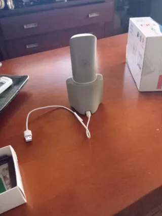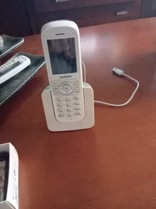 Teléfono inalámbrico de la marca Huawei en color blanco y gris, vale lo mismo para fijo que para móvil - Diseño moderno y elegante. - Base de carga incluida. - Cable USB para carga.
