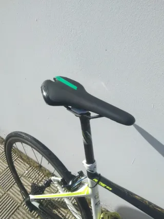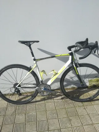 Bicicleta de carretera Mérida con cuadro de carbono. - Cuadro de carbono. - Color blanco y verde lima. - Incluye portabidones. Manillar carbono. Ruedas visión 35mm Tiagra