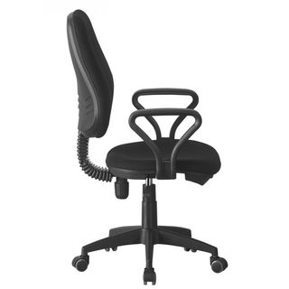 Silla de oficina Medidas: Ancho: 56 cm; Fondo: 53 cm; Altura: 98 ~ 110 cm Armazón de nylon con acabado de color negro Respaldo alto Mecanismo de contacto permanente de respaldo, con mando de ajuste de la intensidad. Regulación de altura mediante cilindro neumático con acabado negro Brazos Base de poliamida de 5 radios de color negro Ruedas blandas de 50 mm. de Silent Nylon Asiento y respaldo tapizado en tejido acrílico de color negro