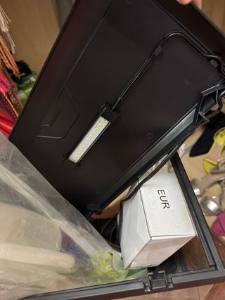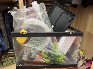 Pecera con accesorios para crear un hogar acuático. - Estructura principal de cristal. - Tapa y accesorios de plástico. - Incluye elementos decorativos y tubos.