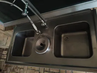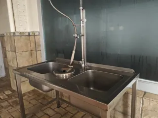 Fregadero de acero inoxidable de doble seno con grifo de ducha. - Diseño robusto y funcional. - Ideal para entornos profesionales. - Acabado plateado y gris.