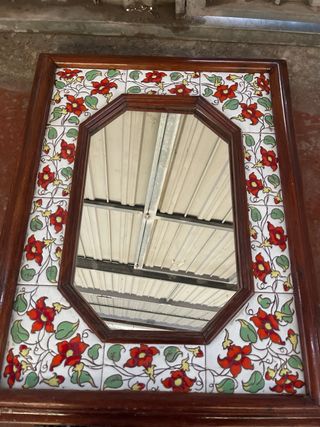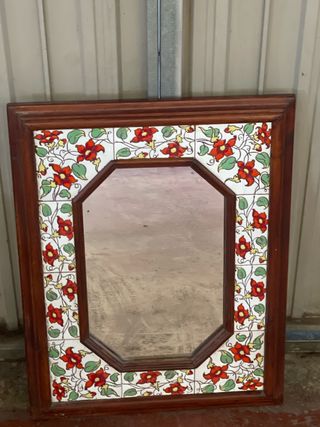 Elegante marco de espejo con un diseño de cerámica pintada a mano. - Marco de madera con detalles florales en cerámica. - El espejo tiene forma octogonal.