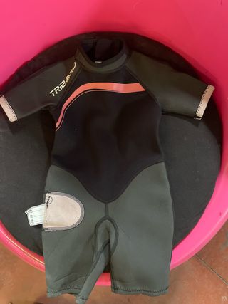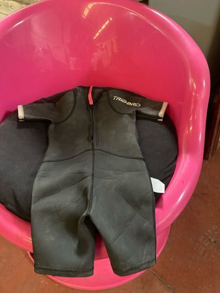 Neopreno de manga corta para bebé de la marca Tribord. Ideal para proteger del sol y el frío en actividades acuáticas. - Color negro con detalles en coral. - Cierre de velcro en la zona del hombro. - Parche de protección en la zona del asiento.