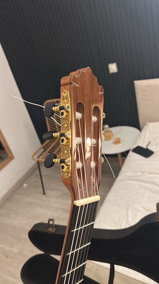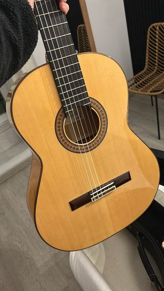 La Guitarra Paco Castillo 215F es un instrumento totalmente hecho a mano Tapa: Abeto macizo Aros y fondo: Ciprez macizo Diapasón: Cedro de Honduras con alma de ébano Clavijeros: De lujo Perfiles: Palosanto de India Acabado: Brillante