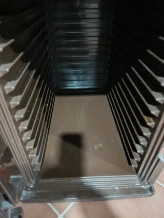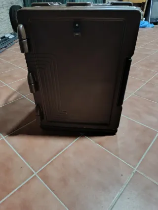 Contenedor térmico de color marrón oscuro, ideal para mantener la temperatura de alimentos. Incluye cinco bandejas de acero inoxidable. - Exterior robusto y resistente. - Puerta abatible con cierre seguro. - Interior espacioso para varias bandejas.