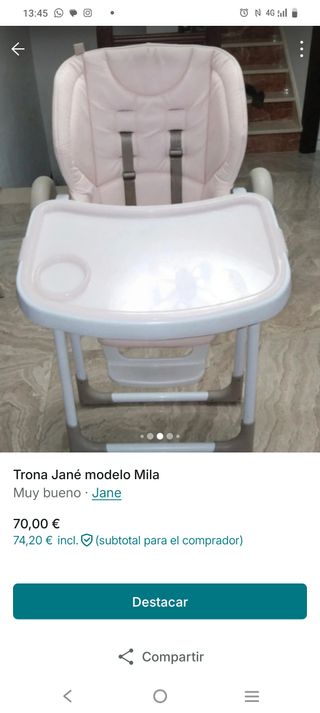 Trona Jané modelo Mila en muy buen estado. - Color: Rosa pálido. - Incluye bandeja. - Arnés de seguridad de 5 puntos.