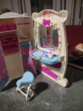 Armario de Nancy con tocador y accesorios. - Puertas abatibles con diseño. - Compartimentos interiores para guardar. - Tocador con espejo y accesorios. - Incluye un pequeño taburete.