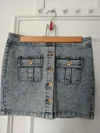 Falda vaquera con un diseño moderno y desgastado. - Bolsillos frontales con solapa. - Cierre de botones. - Detalle de costuras.