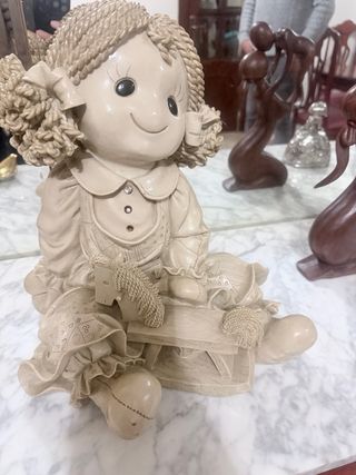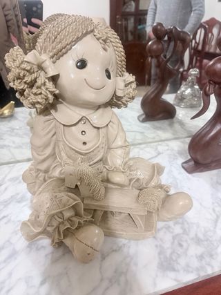 Figura decorativa de una muñeca con detalles de trenzas y vestido. - Material: Resina. - Diseño: Muñeca sentada con un pequeño banco y ovillos de lana. - Acabado: Color beige, con pequeños detalles brillantes en el cuello.