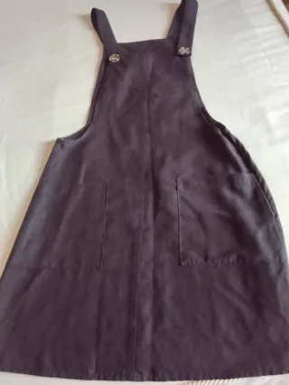 Peto de tela negro con un diseño moderno y práctico. - Dos bolsillos frontales. - Tirantes ajustables con botones. - Costuras detalladas.