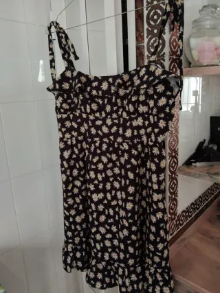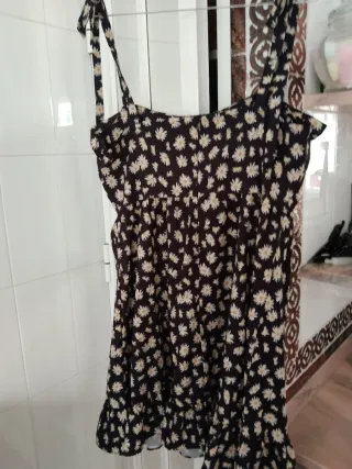 Vestido negro con un bonito estampado de flores blancas y amarillas. Tiene tirantes finos y un bajo con volantes. - Diseño de tirantes. - Bajo con volantes.