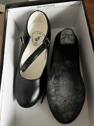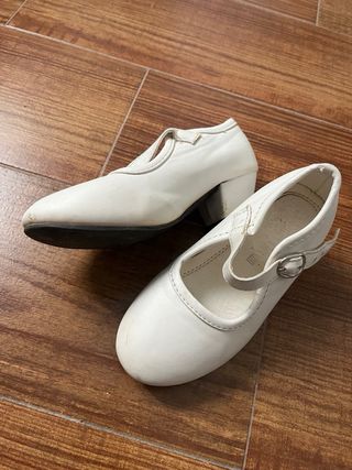 Zapatos de flamenco para niña, talla 32 en negro, los blancos corresponden a talla 26 y 27. Perfectos para clases o actuaciones. 3€ cada par - Diseño clásico con tira. - Detalle de hebilla. - Suela antideslizante.