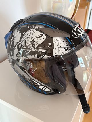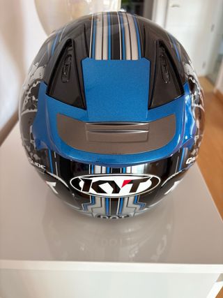 Casco de moto con un diseño moderno y llamativo. - Diseño gráfico en blanco, negro y azul. - Visera transparente. - Marca Kyt.