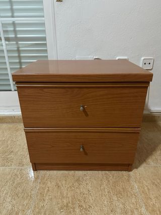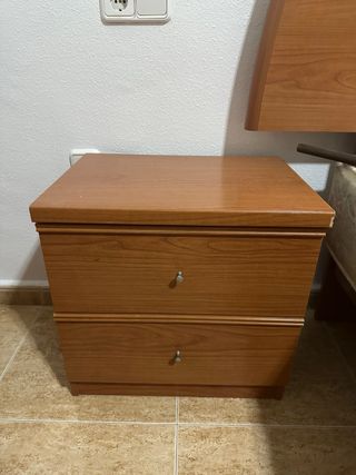 Conjunto de muebles de habitación en color madera, ideal para organizar tu espacio. - Cómoda con varios cajones. - Mueble auxiliar a juego.
