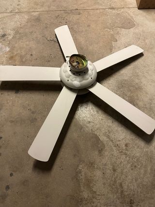 Ventilador de techo con aspas blancas. Disponibles 3 un: 40€/un - Diseño de cinco aspas. - Base decorativa. - Componentes metálicos y plásticos.