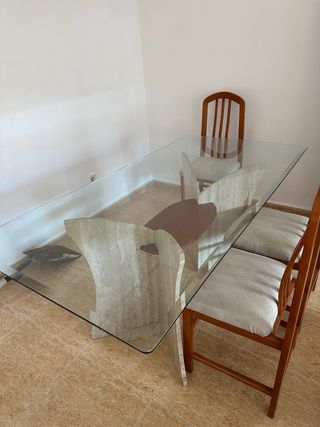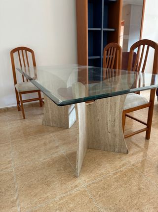 Elegante mesa de comedor con base de mármol y tapa de cristal. - Diseño moderno y sofisticado. - Base con acabado en piedra. - Superficie de cristal transparente.