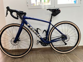 Bicicleta de gravel/carretera Trek Domane AL 2 en color azul. Talla 52 Horquilla de carbono - Cuadro de aluminio - Frenos de disco. - Transmisión Shimano. Claris. Pedales mixtos shimano. Lleva cubiertas de gravel, vittoria 38mm nuevas. Las llantas llevan el kit para tubelizar. Entrego cubiertas de carretera bomtraller 32mm. Y pedales de carretera look. Toda equipada de repuestos y luces led, preparada para rodar.