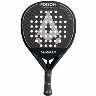 Pala de pádel Alacrán Poison, modelo Excellence Series. Diseño moderno y llamativo. - Acabado en carbono con patrón de puntos. - Logo central en forma de triángulo. - Detalles en color gris y blanco.