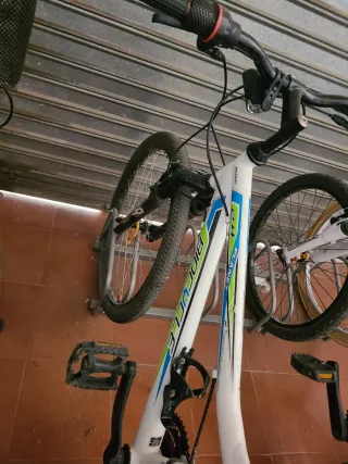 Bicicleta de montaña BIOCYCLE con cuadro blanco y detalles en verde y azul. - Ruedas de 26 pulgadas. - Frenos de disco. - Cambio Shimano. - Suspensión delantera.