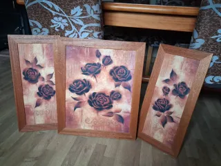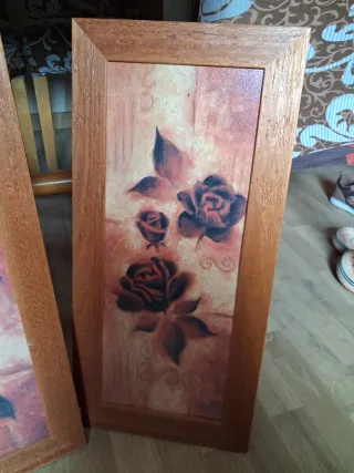 Conjunto de tres cuadros decorativos con un diseño de rosas. - Cada cuadro está enmarcado en madera. - El fondo tiene un patrón sutil. - Las rosas son el elemento central del diseño.