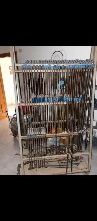 Se venden sargentos o mordazas de barra. Son herramientas de carpintería para sujetar piezas. - Estructura metálica. - Mangos de plástico azul.