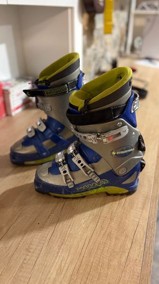 Botas de esquí para travesía y montaña. TALLA 42 - Marca: LOWA - Modelo: Stratum - Color: Gris, azul y amarillo lima. - Cierre con ganchos y correas.