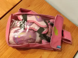 Set de protecciones para patinaje infantil. - Incluye rodilleras y coderas. - Diseño en color rosa y morado. - Cierre con velcro ajustable. - Marca Decathlon.