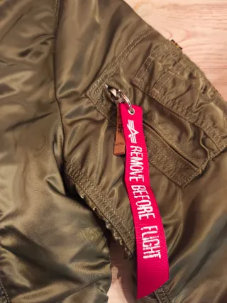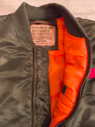 Chaqueta estilo militar Alpha Industries, modelo MA1. - Color verde oliva. - Forro interior naranja. - Cremallera frontal. - Bolsillos laterales. - Como nueva !!