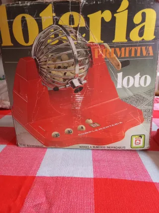 Máquina para jugar a la Lotería Primitiva. - Color rojo. - Incluye bolas. Sin cartones. Una varilla del bombo está tocada. Base de plástico