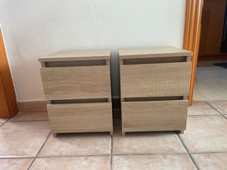 Conjunto de dos mesitas de noche con acabado en color roble. - Fabricadas en aglomerado. - Diseño moderno con dos cajones cada una.