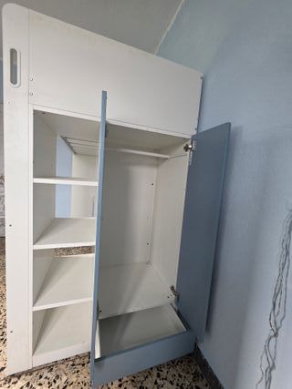 Conjunto de mobiliario infantil que incluye cama elevada, escritorio y armario. - Estructura de cama alta con escalera. - Escritorio integrado. - Armario con puertas.
