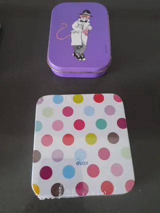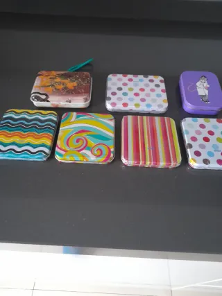 Conjunto de siete cajas metálicas con diseños variados y coloridos. Están sin estrenar solo una esta usada - Diseño de lunares blancos y rosas. - Diseño de lunares blancos y morados. - Diseño de rayas verticales multicolores. - Diseño abstracto en tonos turquesa y amarillo. - Diseño de olas en zig-zag multicolor. - Diseño de paisaje con árbol naranja. - Diseño de personaje morado con detalles.