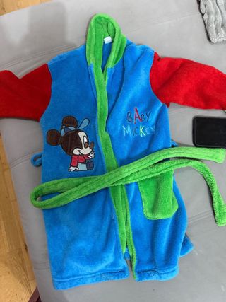 Bata de bebé con diseño de Mickey Mouse. - Mangas rojas. - Ribetes y cinturón en verde. - Estampado de Mickey Mouse. - Texto Baby Mickey bordado.