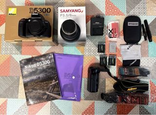 Se vende cámara réflex Nikon D5300 junto con un objetivo Samyang 8mm f/3.5 y varios accesorios. - Cámara réflex digital Nikon D5300. - Objetivo Samyang 8mm f/3.5 UMC Fish Eye CS II. - 4 baterias, una original y 3 patona, de lo mejor del mercado. - Libro nikon5300 Rober Silvan - Grip, Empuñadura vertical. - Tapa de objetivo. - Caja original del objetivo Samyang. - Caja original de la cámara Nikon. - 3 correas incluyendo original. - 2 protectores de pantalla - Bolsa polaroid con gamuzas y lapices de limpieza