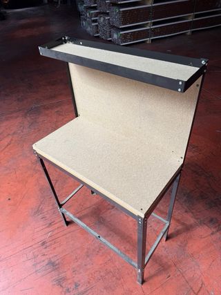 Mesa de trabajo robusta con estructura metálica y superficie de madera. - Estructura de metal resistente. - Superficie de madera. ---- carpintería, martillo, destornillador, sierra de calar, carpintero, sierra circular, ingletadora, taller, fábrica