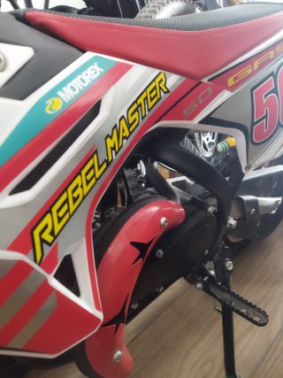 Moto de motocross para niños con diseño Rebel Master. - Diseño deportivo en rojo, blanco y negro. - Rueda delantera de tacos.