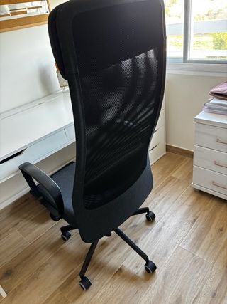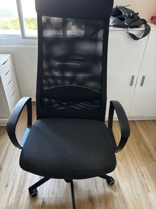 Silla de oficina con diseño ergonómico y respaldo alto. - Respaldo de malla transpirable. - Asiento acolchado. - Brazos curvos. - Base con ruedas para fácil movilidad.