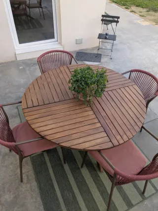 Conjunto de mesa redonda y cuatro sillas, perfecto para tu jardín o terraza. - Mesa de madera de acacia, 130cm diámetro - Sillas con estructura metálica y asiento de tela. - Diseño moderno y cómodo. En perfecto estado.