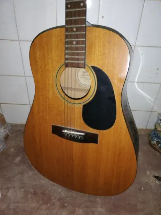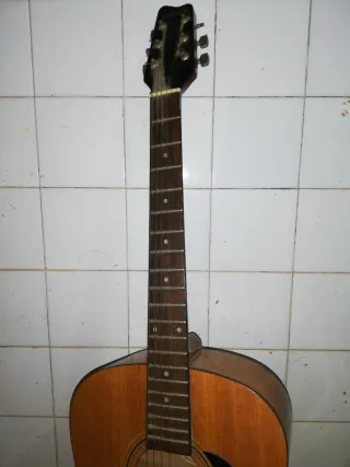 Guitarra acústica de color marrón con cuerdas de metal. - Cuerpo de madera. - Diapasón de madera con trastes. - Puente de madera con clavijas. - Roseta decorativa alrededor de la boca.recoger en mano gracias 641951583