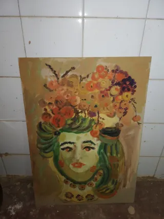 Cuadro decorativo con un diseño abstracto. - Representación de una mujer con un tocado de flores. - Paleta de colores cálidos y vibrantes.