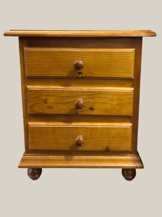 Mesitas de noche de madera de pino con tres cajones. - Tiradores redondos de madera. - Patas torneadas. - Diseño clásico.