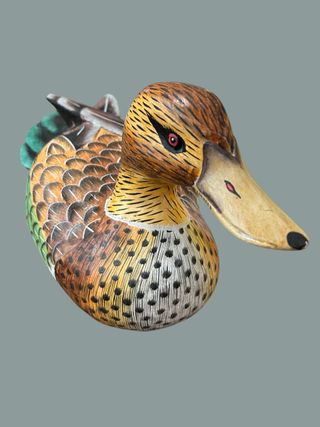 Figura decorativa de un pato tallado en madera. - Detalles pintados a mano. - Colores vivos y realistas. - Ideal para coleccionistas o decoración.