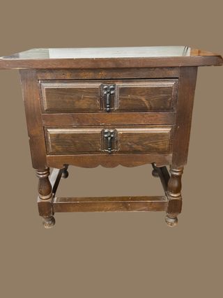 Conjunto de dos mesitas de noche de madera con un diseño clásico. - Tiradores metálicos ornamentados. - Patas torneadas. - Frontales de cajón con moldura.