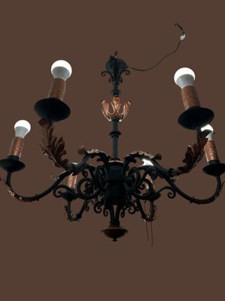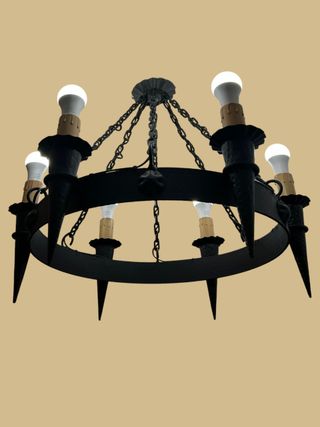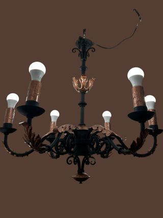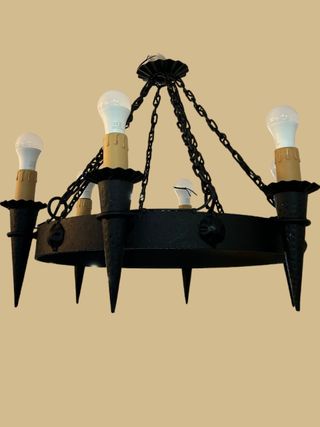 Lámpara de hierro forjado de 6 luces, con diseño clásico y robusto. Ideal para aportar carácter y una iluminación elegante a salones, comedores o espacios rústicos.