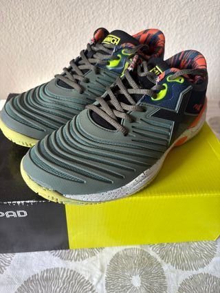 Zapatillas de pádel Munich X-PAD Usadas en 3–4 partidos. Presentan leve desgaste en la punta por arrastre, visible en la foto, sin afectar al uso ni a la sujeción. Buena amortiguación, agarre y estabilidad. Listas para jugar. Se vende por tallaje muy justo. Talla 41.