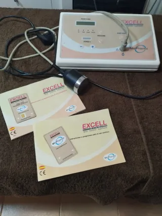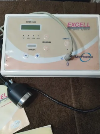 Sistema de ultrasonido para uso terapéutico y estético. Para uso del dolr, inflamación ..y rejuvenecimiento, limpieza facial... Tiene los catálogos donde indica el programa y tratamiento que deseé. - Modelo Excell Plus. - Marca Mia Pharma. - Pantalla digital. - Controles de programa y potencia.